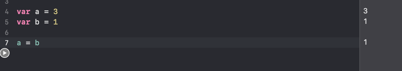 변수 a에 3, b에 1을 할당후 할당연산자로 a의 값에 b의 값을 할당하였다