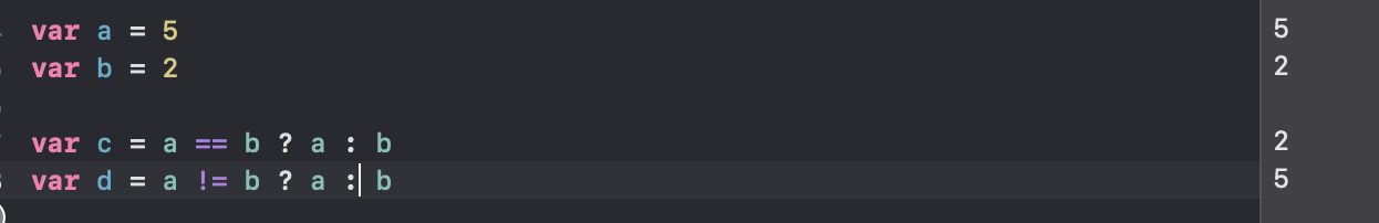 위의 예제에서는 a == b 가 거짓, a != b 가 참이므로 c 는 b, d 는 a 를 반환한다