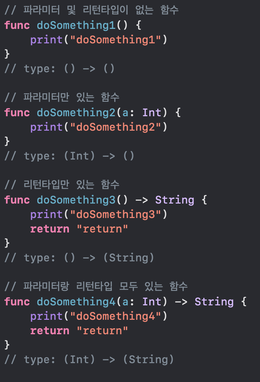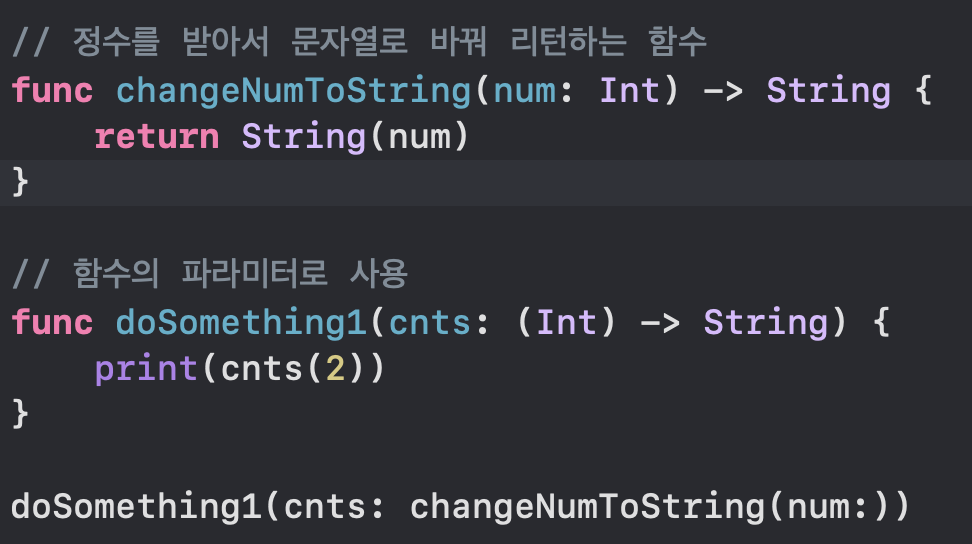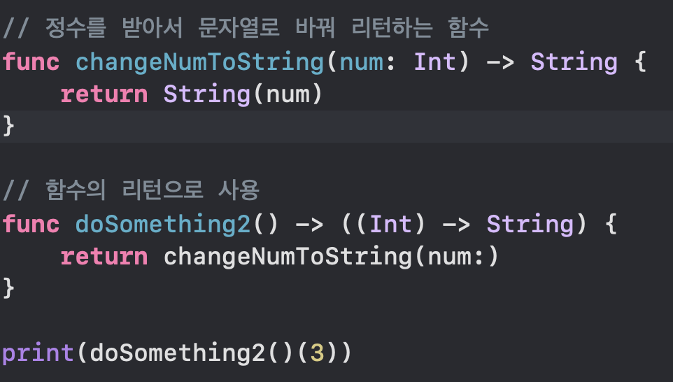 위에서 이미 말했듯이 스위프트의 함수는 1급객체임
