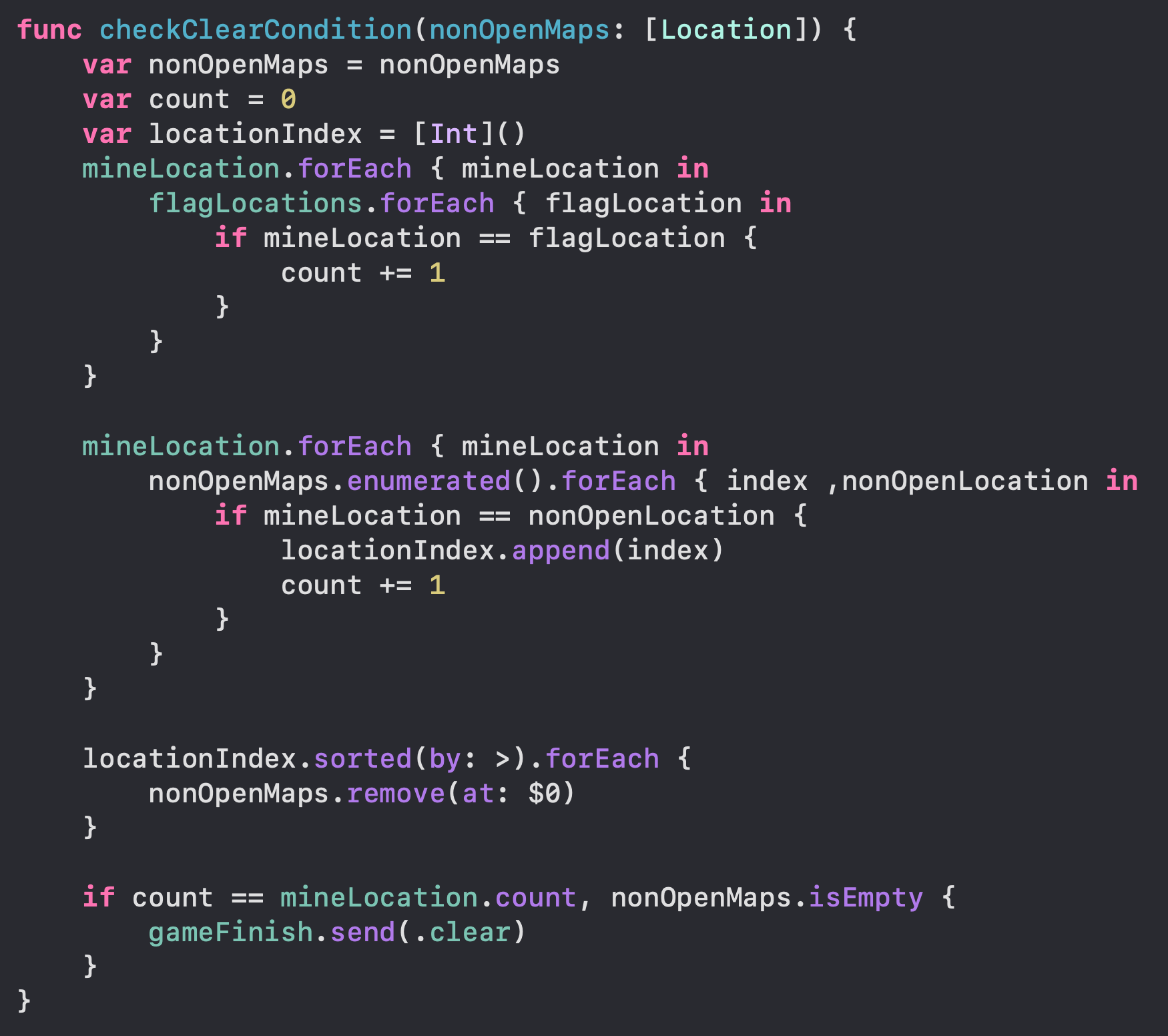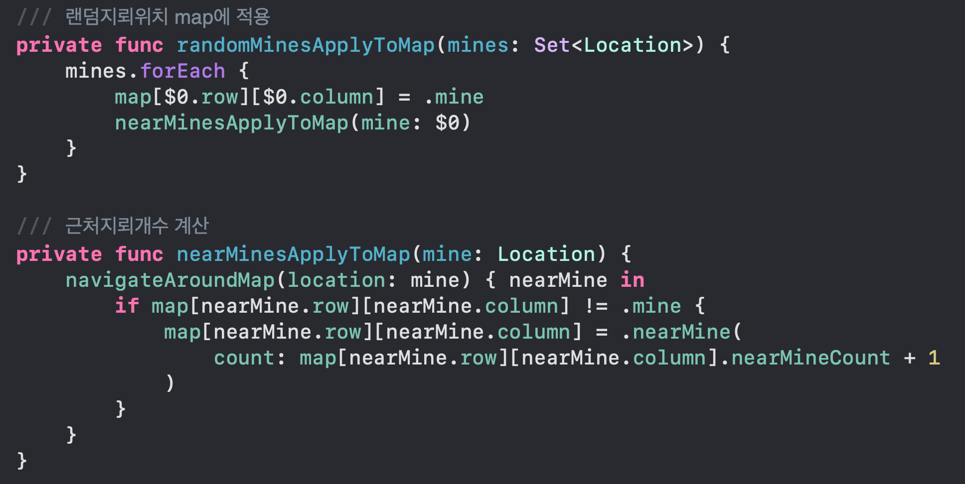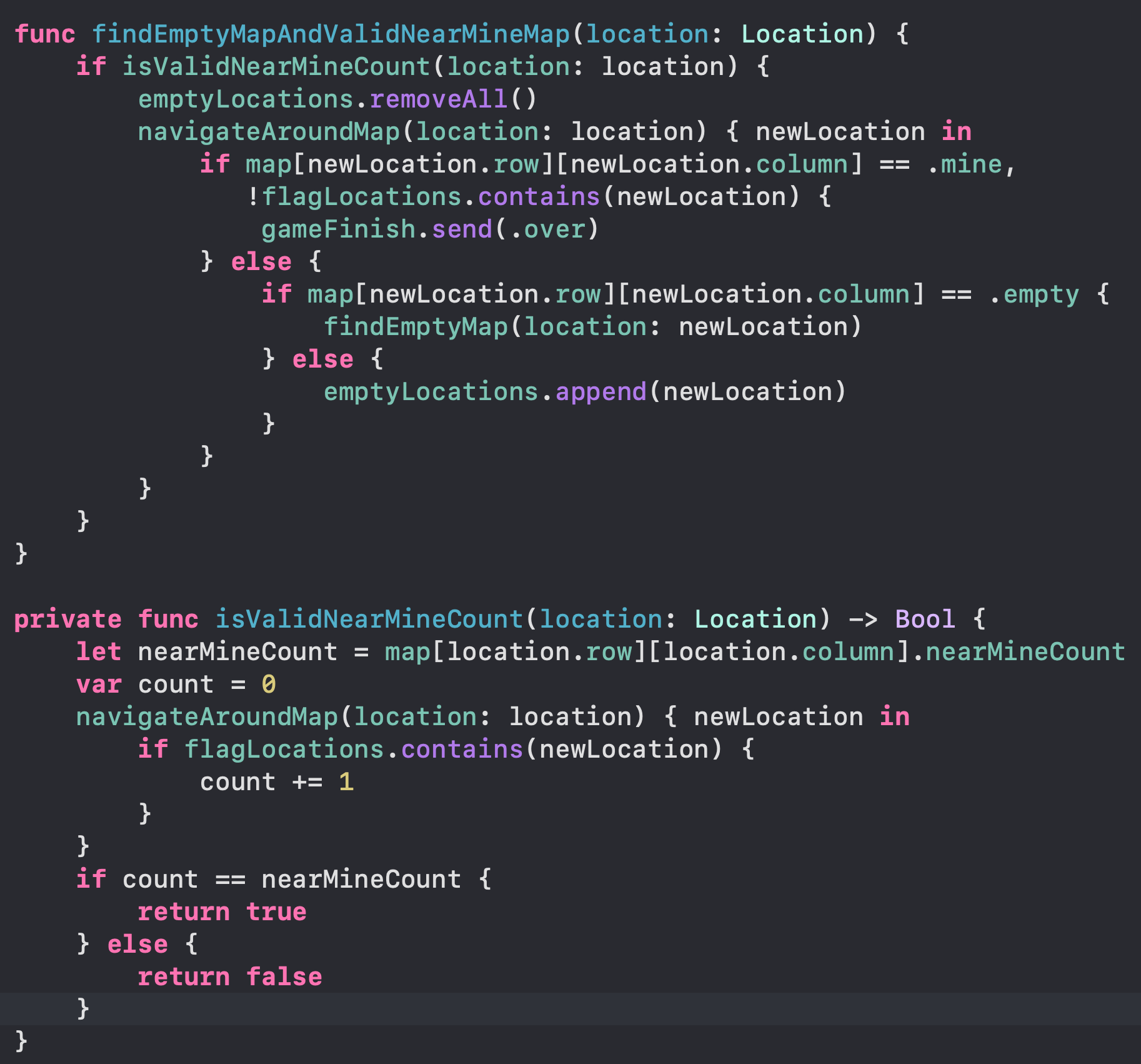 isValidNearMineCount(location:) 함수는 nearMineMap의 count와 근처 flag의 개수를 비교하는 함수이다