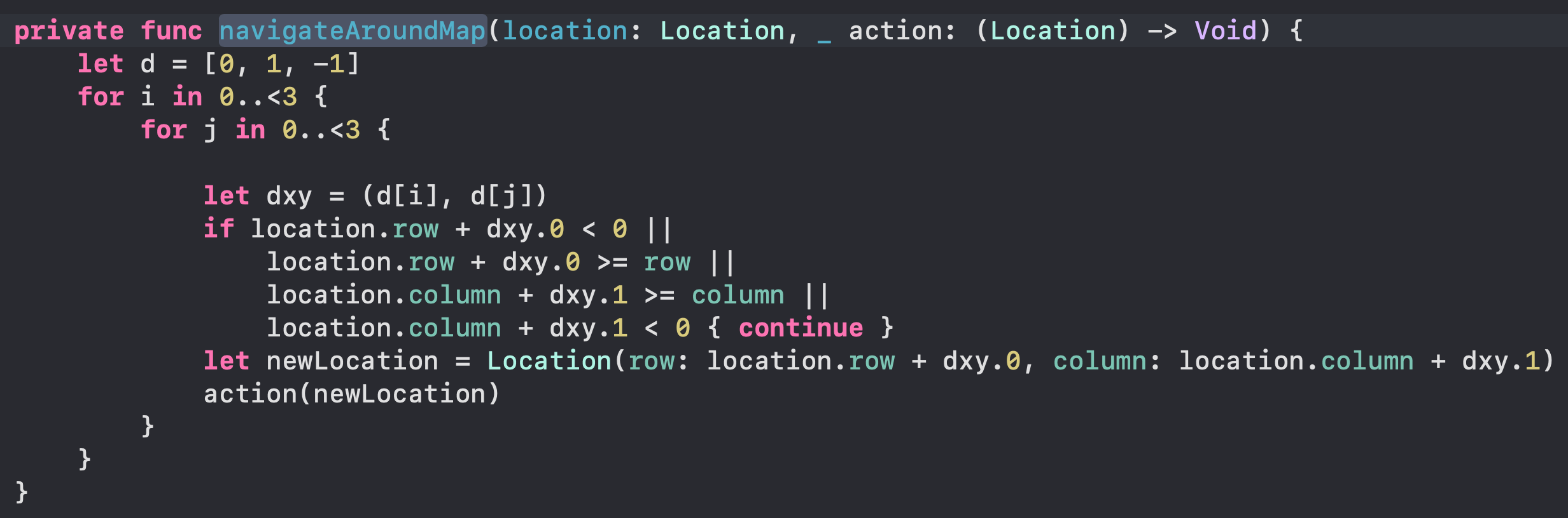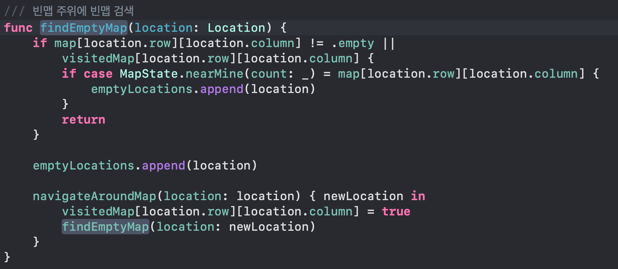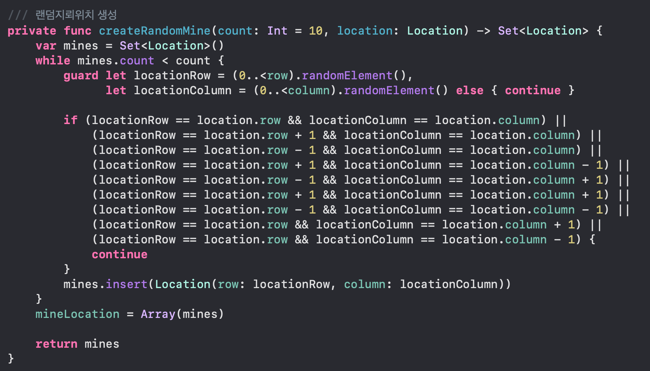 isValidNearMineCount(location:) 함수는 nearMineMap의 count와 근처 flag의 개수를 비교하는 함수이다