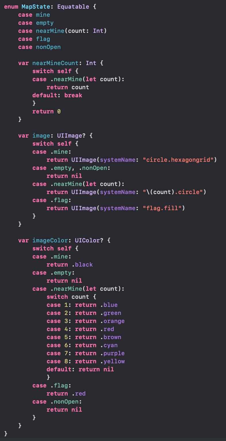 계산프로퍼티로 해당 맵의 근처지뢰계수, 이미지, 이미지 컬러를 받아올 수 있다