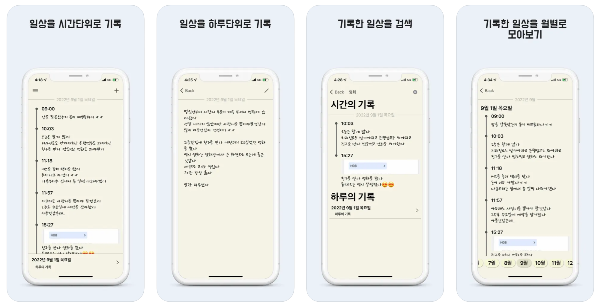 앱의 홈화면에서 오늘 하루 있었던 일을 시간단위로 기록을 하고 하루 전체의 기록을 남길 수 있다